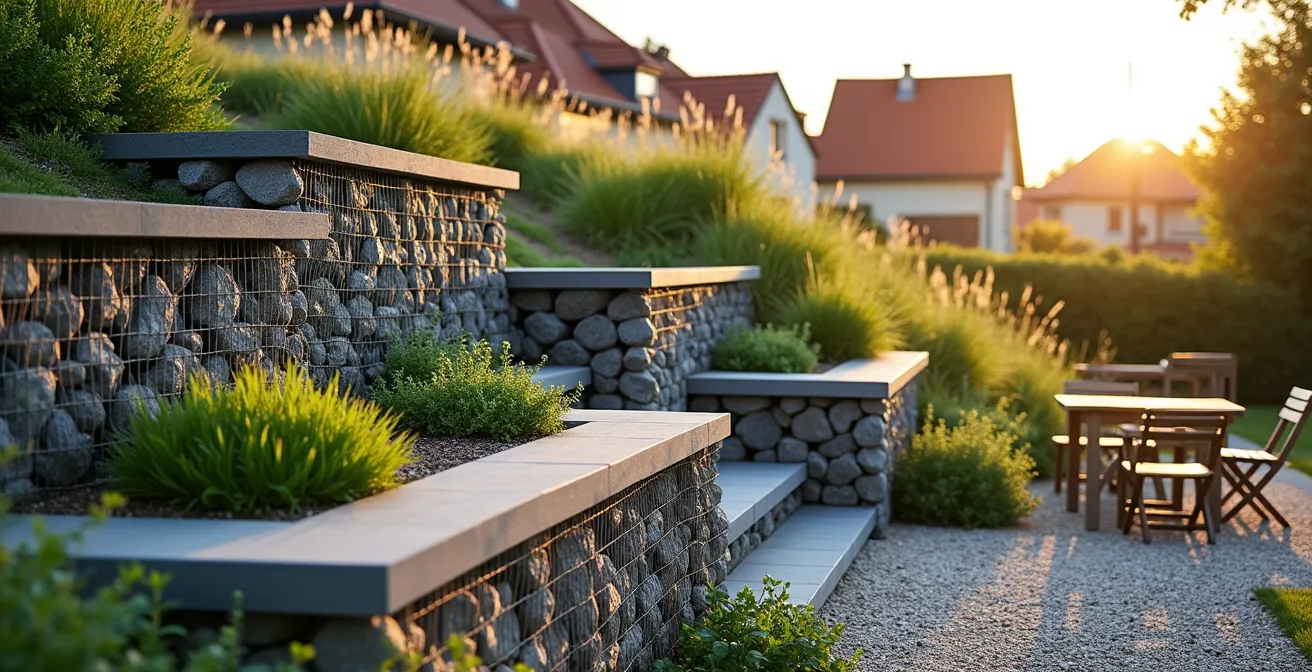 Ein Gartenprojekt von Commaik nutzte eine Kombination aus 1 Meter und 2 Meter hohen Gabionen, um einen langen Hang abzufangen. Zwischen den massiven Steinkörben wurden Pflanzflächen für hohes Chinaschilf gelassen. Die Bewegung der Gräser im Wind sorgt für einen weichen Kontrast zu den starren Steinen und schafft eine lebendige, aber blickdichte Barriere, die nicht erdrückend wirkt.