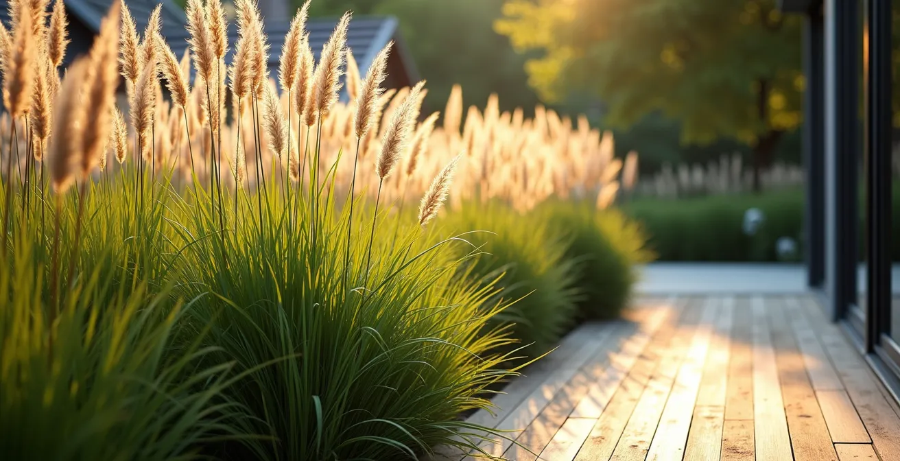 Der Schlüssel liegt in der Abkehr vom Denken in starren Grenzen. Betrachten Sie Ihren Sichtschutz nicht als Mauer an der Grundstücksgrenze, sondern als eine Serie von lebendigen, durchscheinenden Kulissen. Ein von Landschaftsarchitekten oft genutzter Trick ist die strategische Platzierung. Eine geschickt positionierte Gruppe hoher Gräser wie der Rutenhirse ‚Northwind‘ in der Nähe der Terrasse schafft einen intimen, geschützten Außenraum. Der restliche Garten dahinter bleibt sichtbar und wirkt dadurch größer und weiter. Sie definieren Ihren persönlichen Bereich, ohne den gesamten Garten abzuriegeln.